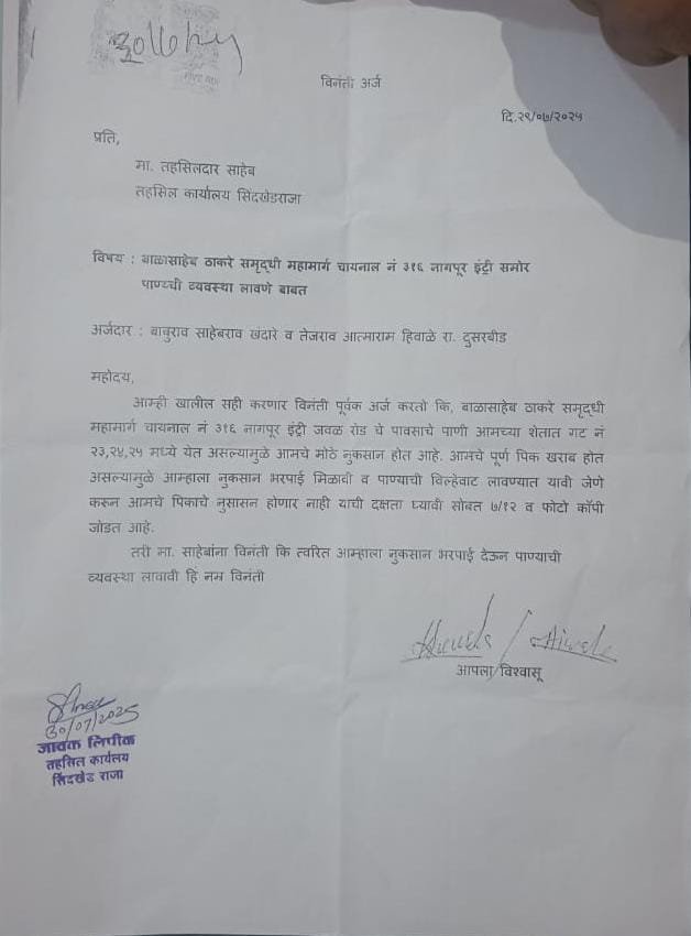 या घटनेची गंभीर दखल घेत स्थानिक शेतकऱ्यांनी सिंदखेड राजा तहसीलदारांकडे लेखी निवेदन सादर केले आहे. या निवेदनात त्यांनी तात्काळ पंचनामा करून नुकसानीचे मूल्यांकन करण्याची आणि शेतकऱ्यांना योग्य ती भरपाई देण्याची विनंती केली आहे. शेतकऱ्यांचे म्हणणे आहे की, त्यांनी वर्षभर मेहनत करून पिके घेतली, परंतु या अनपेक्षित संकटामुळे त्यांचे सर्व काही वाया गेले आहे.